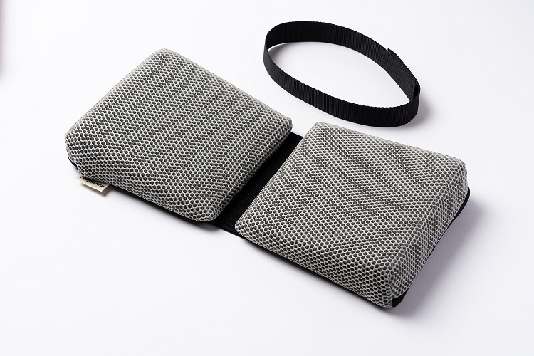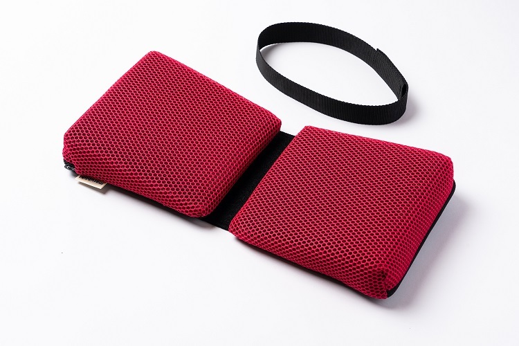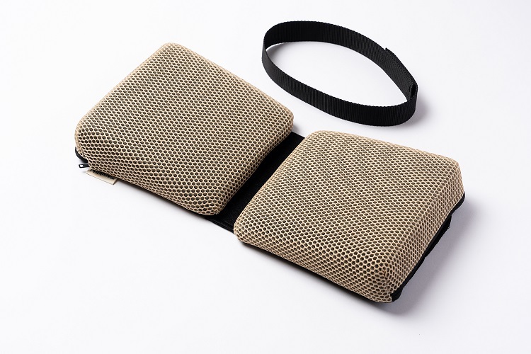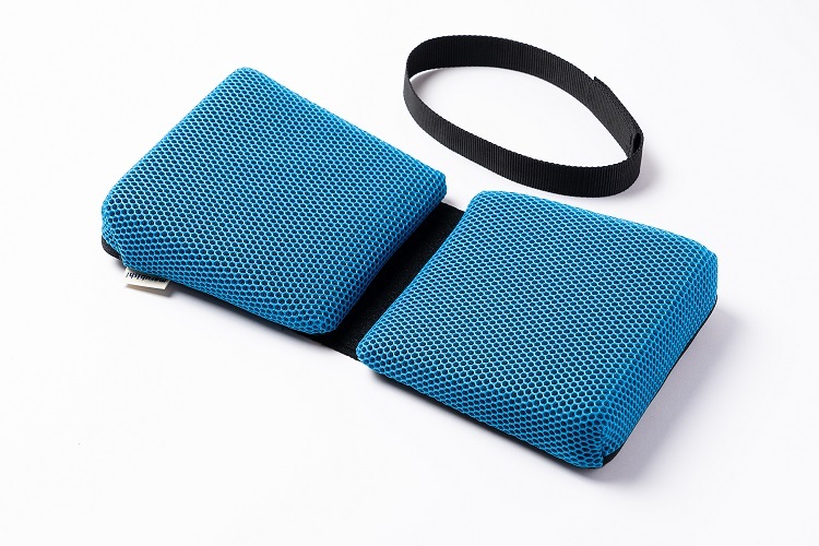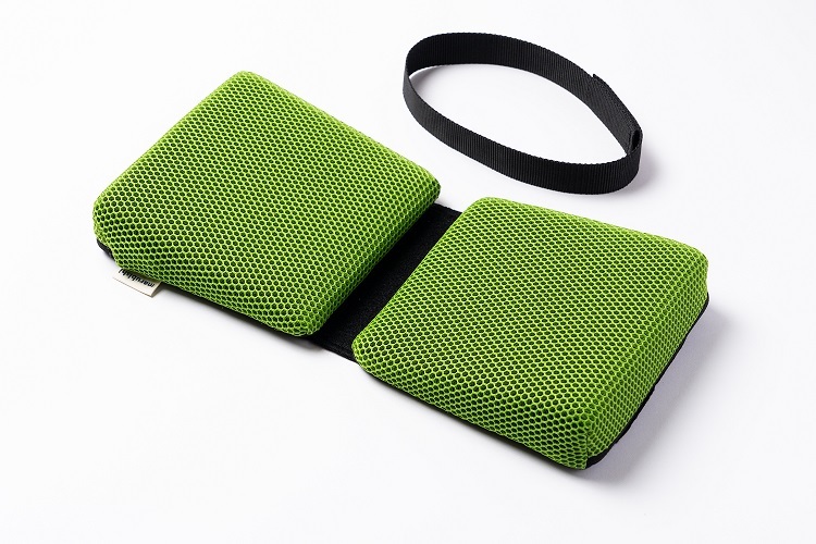 2つの三角形のクッションを自由自在に置いて付属の固定バンドにセットするとしっかりとクッションが固定されます。固定バンドの裏面には滑り止め加工が施され、クッションがズレることはありません。折りたたんでコンパクトに持ち運べるクッション。